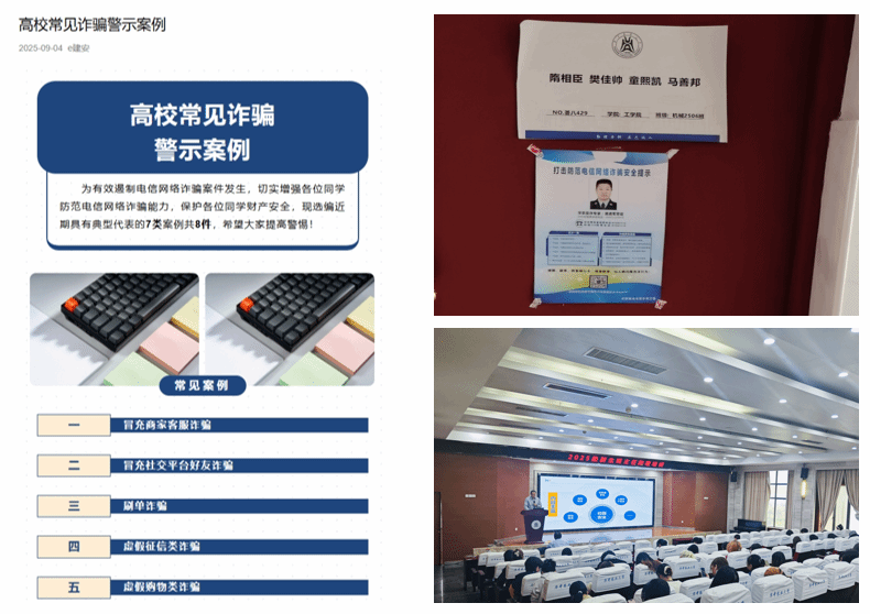支部党员毛骞、邓俊结合多年工作经验,梳理常见电诈案例,重点针对“助学缴费”“AI换脸冒充”等高校近期高发类型,向全校师生推送预警;同时制作1600份《打击防范电信网络诈骗安全提示》宣传单,张贴至新生宿舍,实现精准提醒。此外,他们通过“e建安”平台及工作群、学生群、教工群,常态化推送防电诈推文与视频,让安全警示时刻在线。