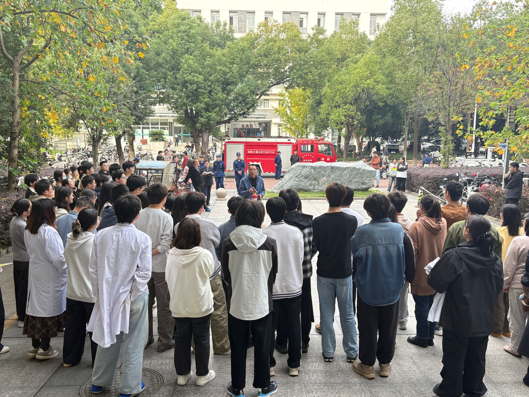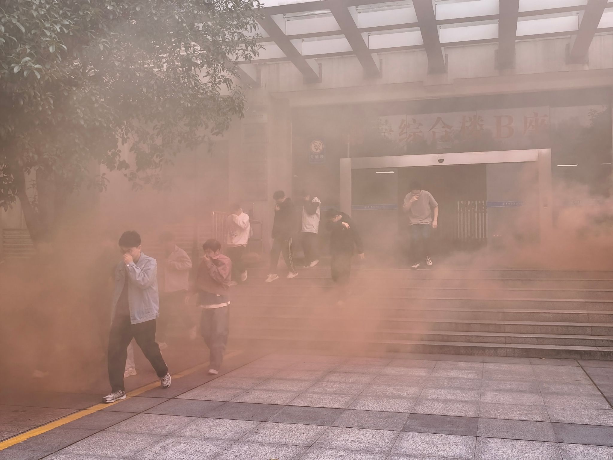 全流程疏散演练,模拟真实应急场景。11月12日下午3点,第一综合楼开展“火警报警、人员疏散、现场救援”全流程疏散演练,在校师生、物业人员、消防控制室值班人员、小型消防站队员、消防车、救援人员全方位参与。随着尖锐的模拟火灾警报声响起,楼内师生立即响应:用湿毛巾捂住口鼻、弯腰低姿,在工作人员引导下沿预定疏散通道快速撤离,全程无拥挤、无慌乱,数分钟内全员抵达安全集合点。疏散结束后,建安部黄青松结合高层建筑结构特点,强调“低头、捂鼻、靠墙”的逃生原则,提醒师生避开火源与浓烟区,沿火势反方向撤离。生命科学技术学院资产管理员涂立超表示,通过模拟真实火灾场景,让师生走一遍疏散通道,切实提升了参与师生的逃生避险能力。